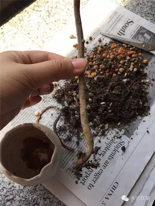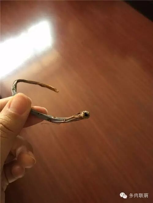 把土刨开,发现根已经全部酥了,一碰就散了,侧芽三年来全部靠着杆子上的水分和营养活着,怪不得侧芽这么迷你