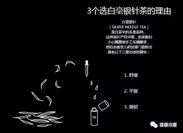 白毫银针对女性的好,只要经常喝,就能够在身上看得见。除了饮用的形式,白毫银针添加到化妆品里,也可以通过另一种形态保养女性。奢侈品香奈儿,从白毫银针中萃取茶氨酸和多元酚的超凡活性成分,正因为它天生具有舒缓镇定功能,制成一款针对敏感性肌肤的舒缓保湿乳液。