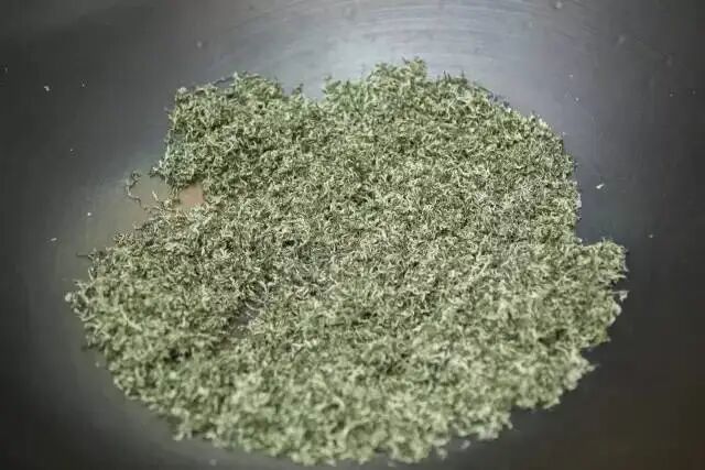 当茶叶干度达六、七成干,时间约10分钟左右,继续降低锅温转入搓团显毫过程。历时12~15分钟左右。4.搓团显毫是形成形状卷曲似螺、茸毫满披的关键过程。锅温50~60°C,边炒边用双手用力地将全部茶叶揉搓成数个小团,不时抖散,反复多次,搓至条形卷曲,茸毫显露,达八成干左右时,进入烘干过程。历时13~15分钟。