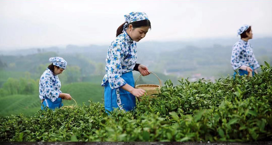 采茶女们于明前时节采摘新鲜嫩芽,从早到晚,每天要弯腰上万次,才能每日摘得几斤芽。