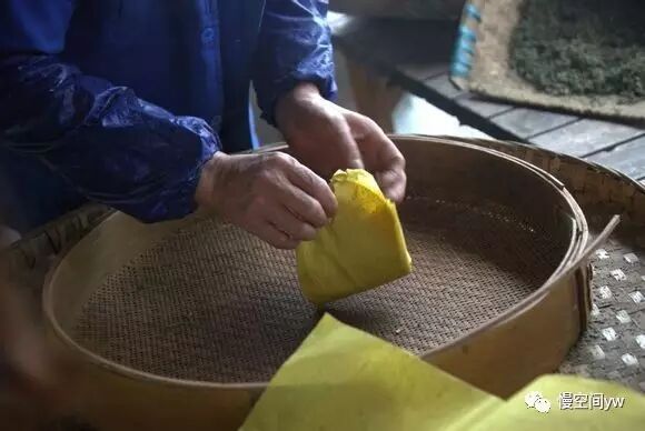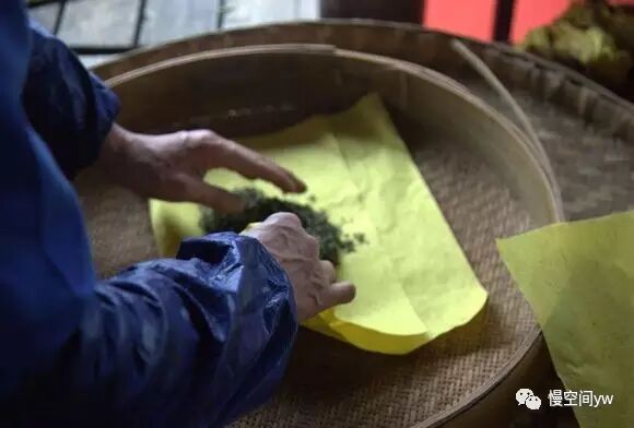 6. 堆积摊放:目的是促时叶内水分均匀分布和多酚类化合物自动氧化,达到黄叶黄汤的要求。将三炒叶趁热撒在细篾簸箕上,摊放厚度5-7厘米,盖上草纸保温,堆积24-36小时,即可四炒。