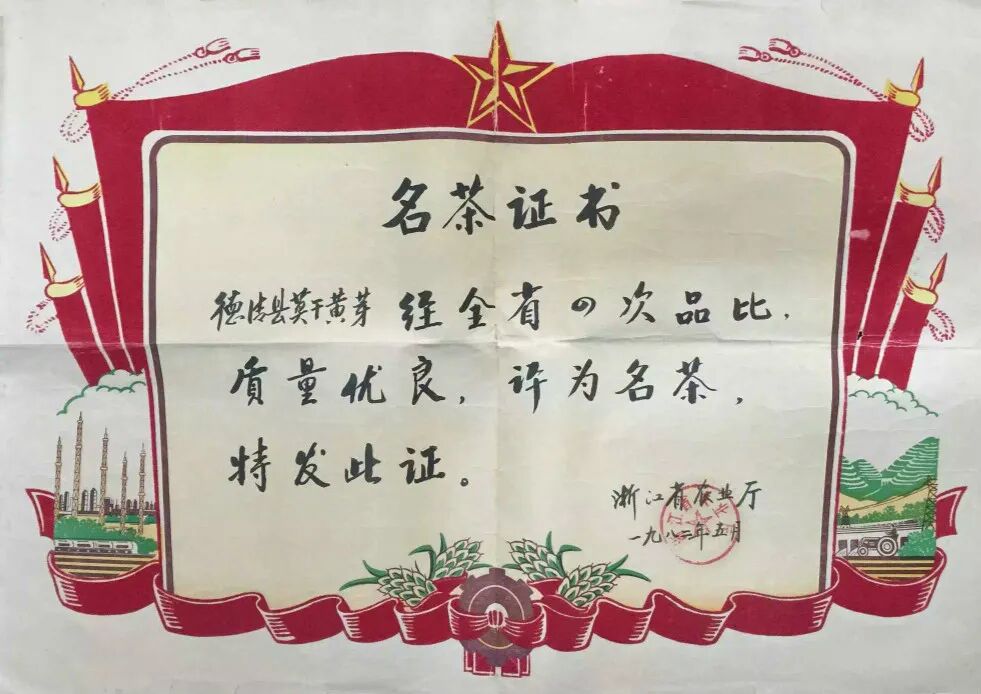 改革开放的春潮推了一把莫干黄芽。庄晚芳教授再到莫干山,感到莫干山芽茶具有黄茶的特征,倡议加以开发利用,为其命名为“莫干黄芽”。黄茶,较之绿茶,多了一道攸关茶品的闷黄工序,边烘边闷,固质挥香。浙江农业大学茶叶系师生在实地考察了梅皋坞、横岭、双桥、碧坞、福水等几个高山茶场后,和茶农们一起加快了恢复和统一黄茶加工工艺。凭借着内质优良,做工精细,1982年5月,“莫干黄芽”获浙江省首批一类名茶,与西湖龙井、余杭径山茶同列。