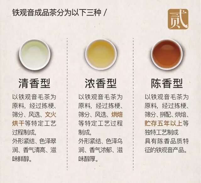 以铁观音毛茶为原料,经过拣梗、筛分、风选、烘焙等特定工艺过程制成,外形紧结、色泽乌润、香气浓郁、滋味醇厚。