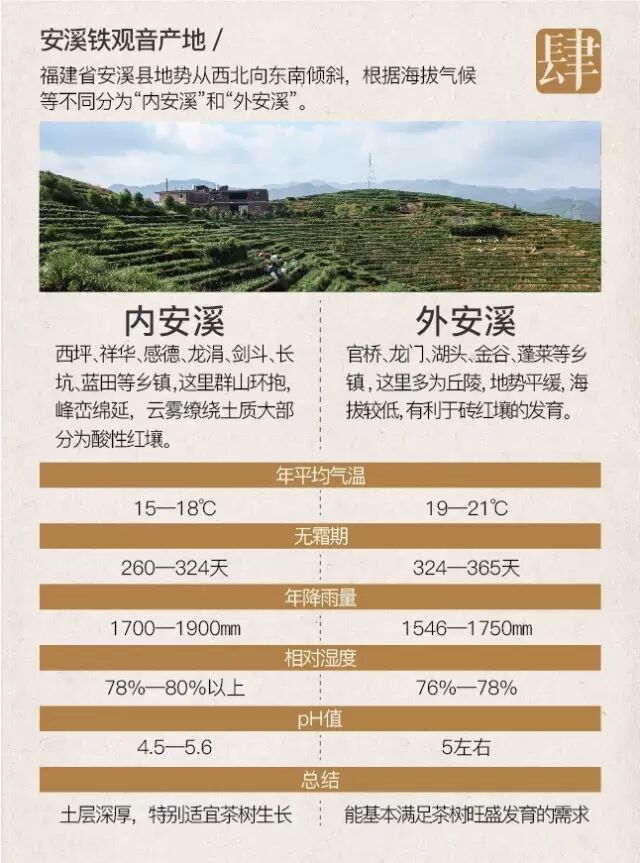 安溪铁观音的产地福建省安溪县地势从西北向东南倾斜,根据海拔气候等不同分为“内安溪”和“外安溪”。内安溪位于西部,以山地为主,层峦叠嶂,最高峰海拔达1600米;外安溪位于东部,以丘陵为主。安溪全境都有产茶,有感德香,祥华味,西坪韵的说法。
