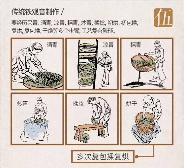 传统铁观音的制作要经历采青、晒青,凉青,摇青,炒青,揉捻,初烘,初包揉,复烘,复包揉,干燥等多个步骤,工艺复杂繁琐。根据制作成品的香型不同,制作过程也会有些许不同,以下是铁观音的主要制作过程。