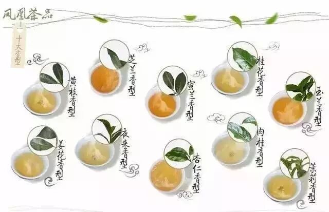 按其成茶的香型分:黄枝香、芝兰香、玉兰香、蜜兰香、杏仁香、姜花香、肉桂香、桂花香、夜来香、茉莉香十大香型和柚花香、橙花香、附子香、黄茶香和苦味茶等品种和株系,其按成茶的香型分类是目前凤凰单丛最通行的分类方法。