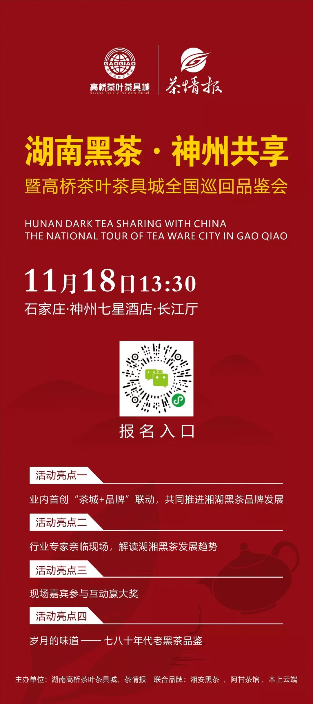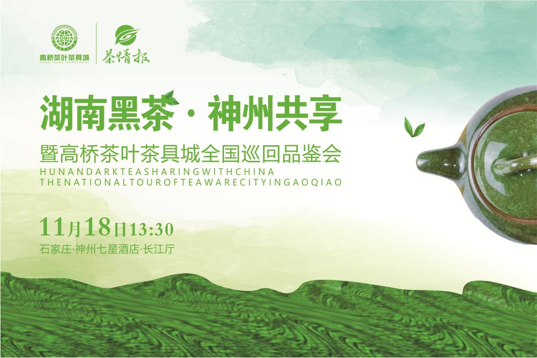 11月18日,湖南高桥大市场茶叶茶具城、茶情报联合湘安黑茶、阿甘茶馆、木上云端三大黑茶品牌举办:2019“湖南黑茶·神州共享”全国品鉴会暨高桥茶叶茶具城全国巡回品鉴会——石家庄站。