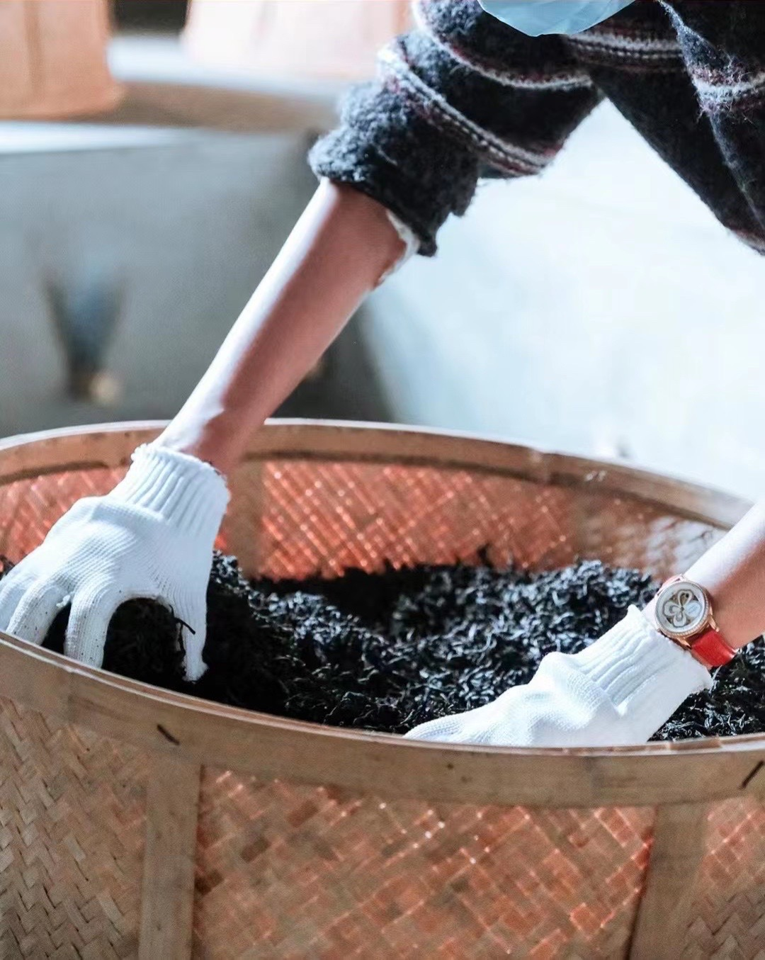 每年5月,茶农采摘佛手鲜叶。精制而成的毛茶经过三道焙火,考验制茶师的眼力、耐心和功夫。经过昼夜看护,一道道工艺,期间用果木文火碳焙几十小时,茶韵净若秋云。