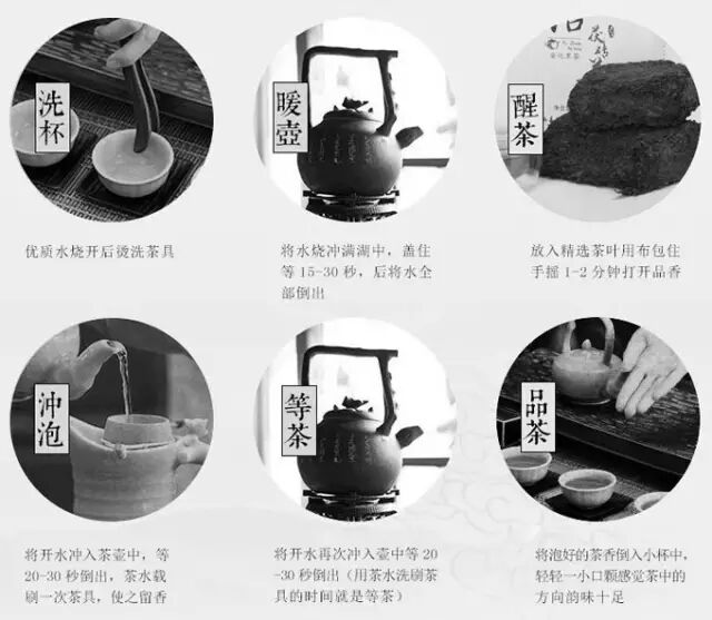 将茶叶按照1:40的比例放入壶中,首先用沸水烫洗一遍茶,洗去灰尘等杂质,再开始煮茶,等茶叶煮到沸腾时,即可饮用;在此时截断热源,再将茶水放置5分左右口感会更佳。 (煮出来的茶味道一般比较浓,有些第一次喝茯茶的茶友可能会不太适应。口味清淡些的茶友,建议倒入开水冲淡茶汤或使用冲泡法。)