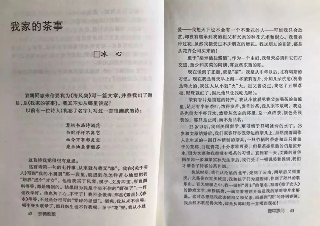 她在《我家的茶事》中写道:“现在我是每天早上沏一杯茉莉香片,外加几朵杭菊。”