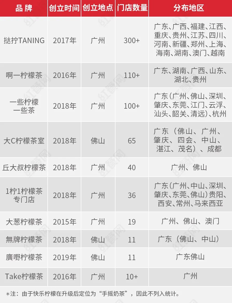 红餐网调查发现,目前大多数柠檬茶品牌都是在广深两地发家,而且门店基本上都在广东地区。即使有的品牌在短短几年间开出了几百家店,触角也伸向广东以外的城市,但大部分门店还是以广东地区为主,即使在外地有店,也只是零星有布局而已。