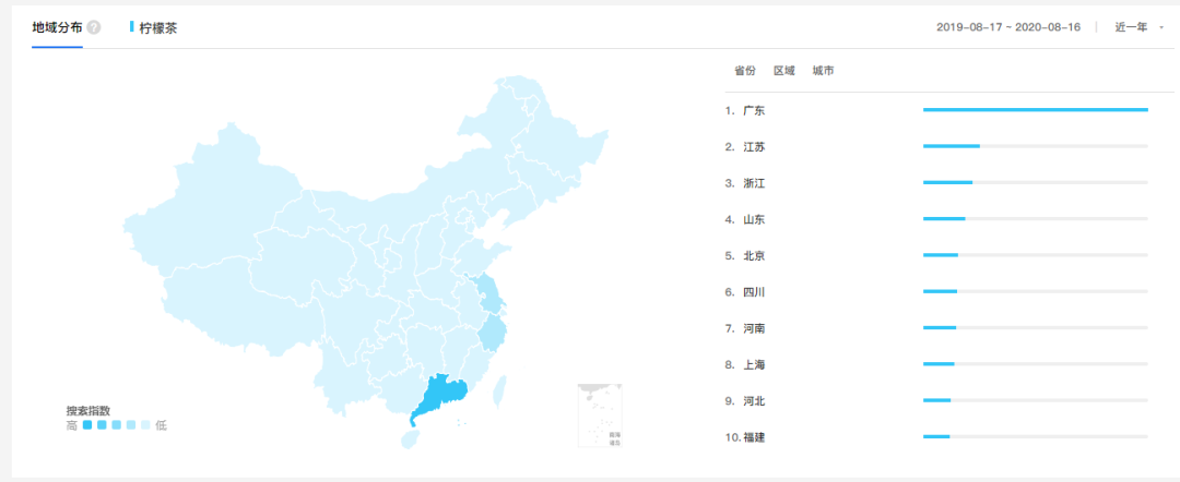 百度指数上的地域指向则更明显,关于“柠檬茶”这一关键字的搜索人群画像,广东排在第一,而且与二、三名的江苏和浙江两地相差甚远。