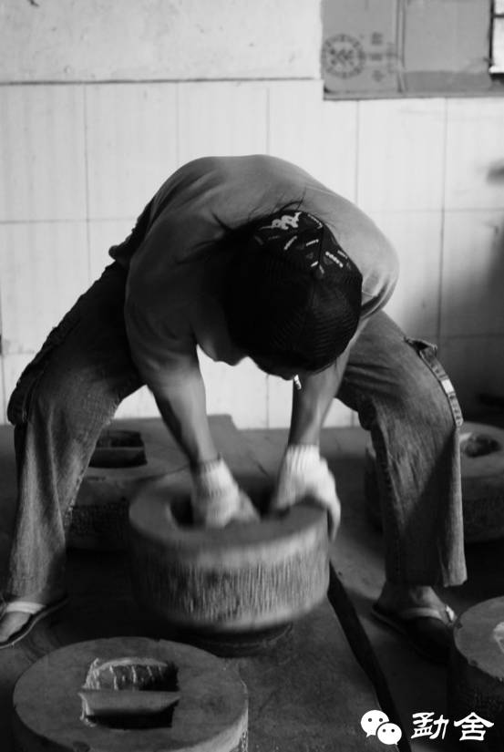 ▲使布袋内蒸软的茶叶成形后用石磨进行压制工序,这部分工序我们完全遵照古法采用全手工完成。