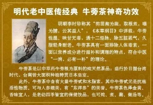 牛蒡茶是以中草药牛蒡根为原料的纯天然茶品;盛行于中国台湾日占时期,台南曾大面积种植特供日本皇室,