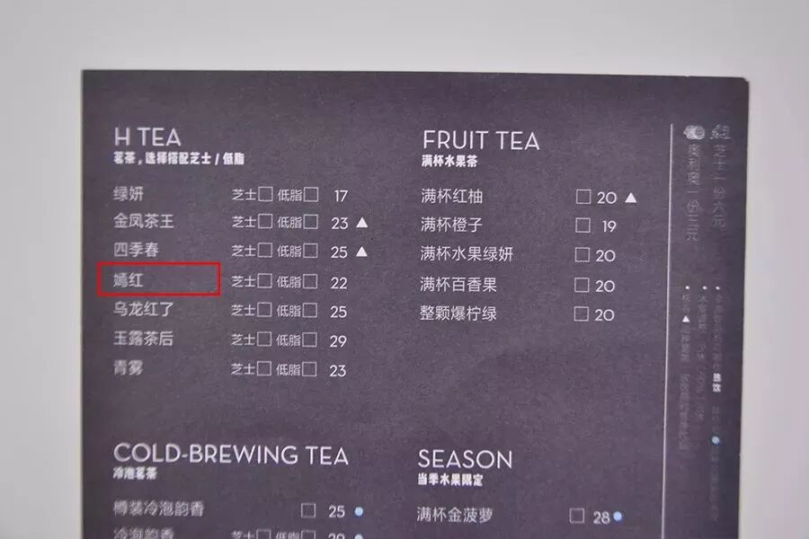 嗯,下面喜茶的菜单那么多款产品,初一看没有一款产品是红茶,其实嫣红就是红茶。