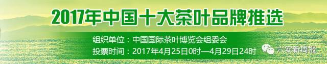 4月25日,由中国国际茶叶博览会组委会组织的“2017年中国十大茶叶品牌推选”正式启动,将从绿茶、红茶、乌龙茶、白茶、黄茶、黑茶六大茶类,几十个茶叶品牌中推选出十佳品牌。作为六安市唯一选送参选品牌,六安瓜片代表着六安,代表着安徽,象征着老区人的荣誉。