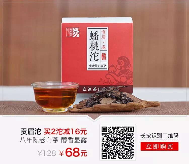 本期杯小茶为茶友们推荐的是来自磻溪的老白茶,八年陈的贡眉蟠桃沱,2010年的春茶,香气纯正清高,陈香显,滋味鲜醇,底蕴足。年底将至,发福利喽,这款老白茶价格128元,限时立减60元,福利价只要68元,还能够享受买2沱减16元优惠!这么大的福利,一定要把握住,迟了就抢不到啦!