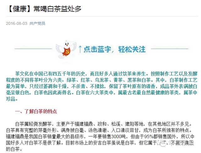 昨天,由新华网承办的中组部“共产党员”微信公众号推介了一篇文章《【健康】常喝白茶益处多》,文章从白茶的特点、品种和喝白茶的七大好处进行了详细的解读。快和小编一起去看看,都有哪些内容?