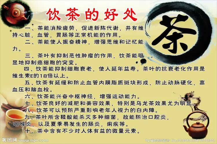 饮茶不但是传统饮食文化,同时,由于茶中含有多种抗氧化物质与抗氧化营养素,对于消除自由基有一定的效果。因此喝茶也有助防老,具养生保健功能,每天喝三两杯茶可起到防老的作用。茶叶中含有多种维生素和氨基酸,喝茶对于清油解腻,增强神经兴奋以及消食利尿也具有一定的作用。但并不是喝得越多越好,也不是所有的人都适合喝茶。那么经常喝茶的好处和坏处有哪些呢:
