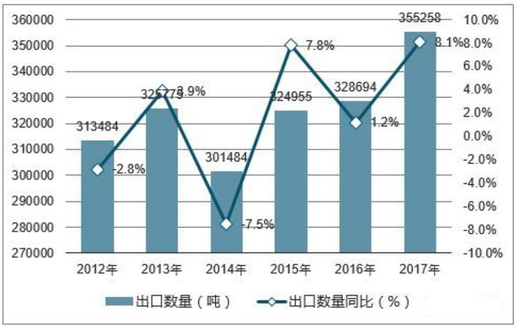 再看中国海关的数据:2017年同年出口量是35.5万吨。也就是每年基本上15%左右的产量是出口的。其他是内销。