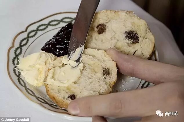 另一个要注意的是司康饼不能用刀切,一定要用手掰。好的司康饼可以轻易用手整齐地掰开。