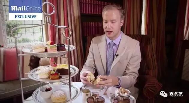 司康饼要搭配奶油和果酱食用,所以接下来,就要给司康饼抹酱。(ps:和吃三明治的装逼法一样,不能直接伸手拿给自己,要先问过别人要不要。)果酱要从容器挖到自己的盘子里,然后再抹在饼上。至于果酱和奶油的顺序,特别稠的奶油是先果酱后奶油,也有是先奶油后果酱。不用特别纠结,喜欢先抹哪个都可以。