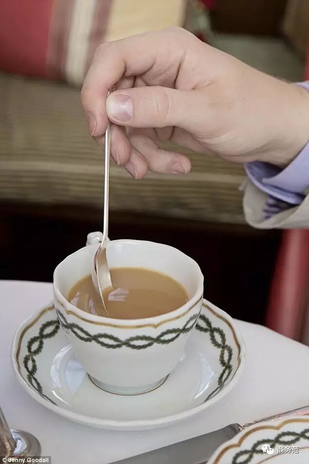 通常我们以为不发出声音,轻轻地画圈搅拌就很优雅了。但这个姿势是错误的。正确姿势是用勺子前后搅动,推开茶水。而且要注意只用手指,而不是手腕的力量。