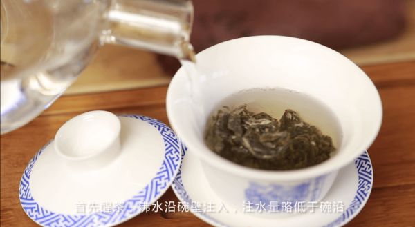 沿着盖碗边缘定点注水,避免直接冲到茶叶上。