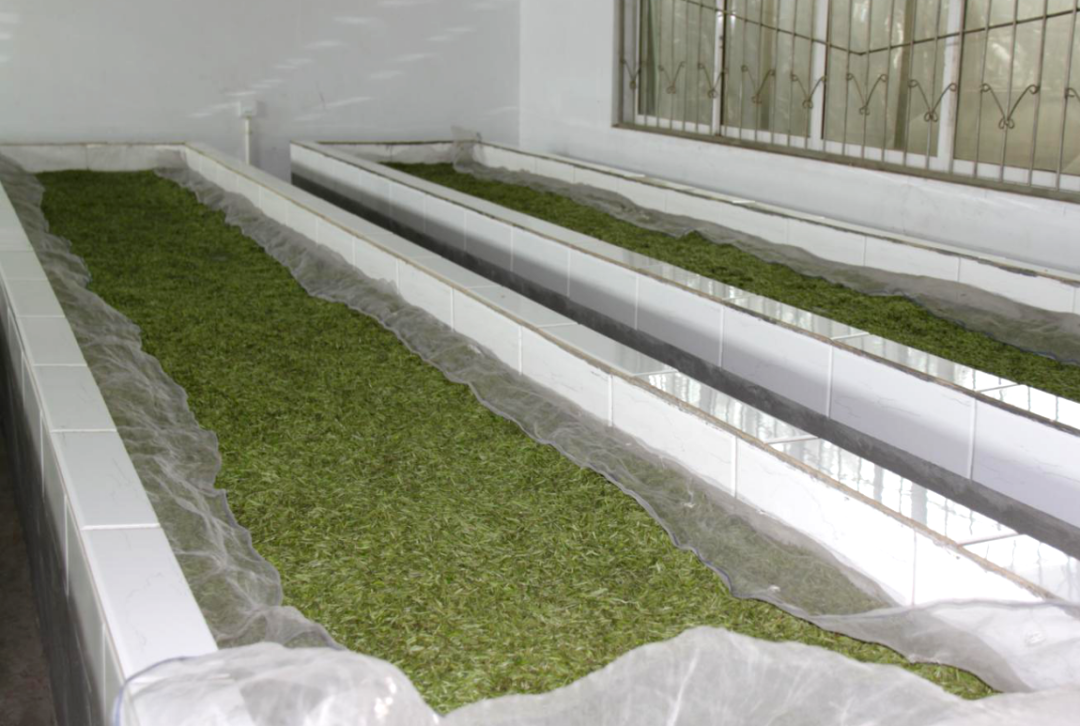 将新鲜采摘的鲜叶均匀摊放于阴凉通风的环境,散发芽叶的水分和青草气,完成摊青的鲜叶,含水量减少,叶片柔软,更有利于后续的杀青工序。