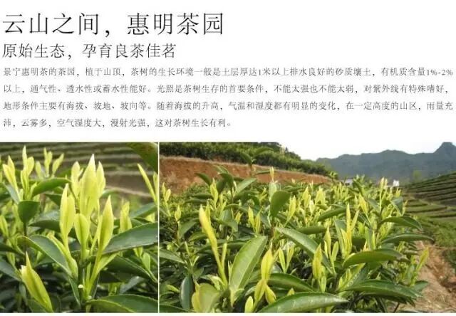历史:景宁惠明茶产于唐咸通二年(861)惠明和尚主持建筑的惠明寺山地,茶以僧名。今存一株苦白茶,树龄已逾千年,为稀罕茶树之一,叶子乳白带淡黄,冲泡后呈白色,人谓"仙茶"。清乾隆五十四年(1789)起,惠明茶列为贡品,并多次获得国内、国际金奖。
