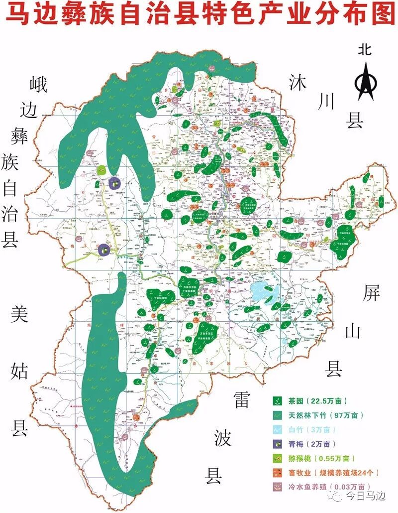 如今,22.5万亩生态茶园基地、100万亩优质竹笋基地、5万亩青梅等林果基地、24个特色畜禽规模养殖场,支撑起马边脱贫奔康的希望。拥着“全国重点产茶县”“全国十大生态产茶县”和“全省最大的林下有机竹笋采集基地”的桂冠,“马边绿茶”“马边猕猴桃”两个地理保护标志产品,30万亩绿色、有机农产品原料基地,让马边在“绿色发展”的道路上越行越稳!