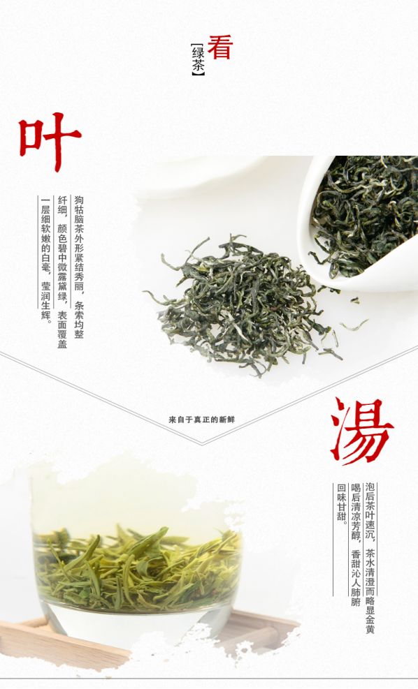 狗牯脑茶外形条索匀整纤细,紧结秀丽,颜色碧中微露黛绿,表面覆盖一层细软嫩的白绒毫,莹润生辉。茶水清澄而略呈金黄,喝后清凉芳醇,香甜沁入肺腑,口中甘味经久不去。饮狗牯脑茶能提神醒脑,消食去腻,益肝利肾。
