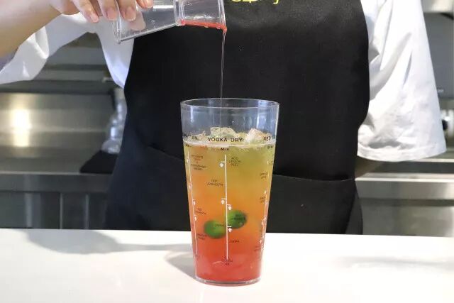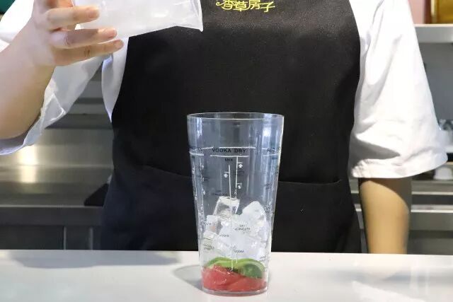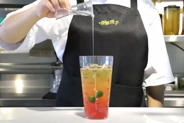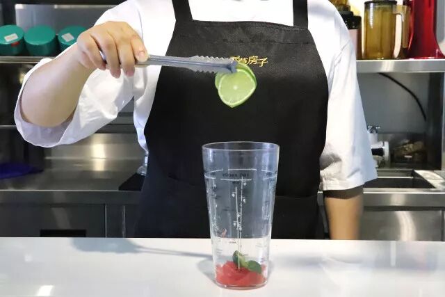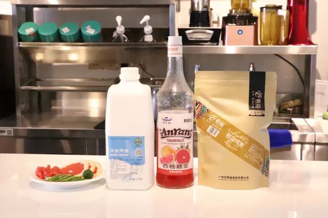 4、加入金桔挤汁、特制果糖、西柚糖浆: