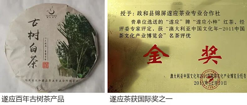 政和县茶文化传承企业锦屏遂应茶业专业合作社的带头人叶功园,携手乡亲建立茶叶基地600多亩,注册“遂应”商标,带领合作社的成员140多人走共同富裕之路。清光绪二十二年(1896),叶氏后代叶之翔首用政和大白茶品种制作红茶,称工夫红茶,后改称政和工夫。1915年,“政和工夫”遂应仙岩红茶和“羊角笋”双获巴拿马万国博览会金奖。2011年,叶功园选送的“遂应小种”红茶获得澳大利亚中国文化年茶文化金奖。