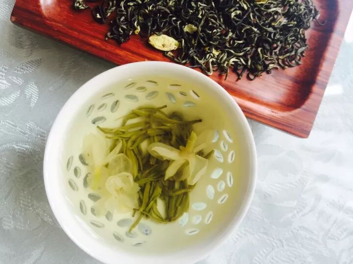 花毛峰性温味甘,绿茶清香高长,汤色黄绿明亮,选择性温、味甘的茉莉鲜花与之配伍,可缓和绿茶的凉性,又可达到理气、解郁、安神的效果。