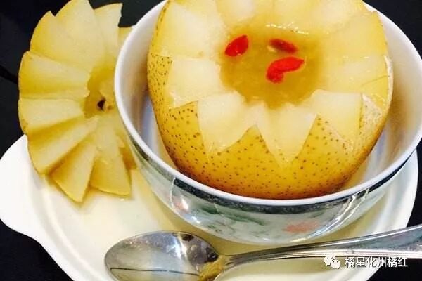 雪梨1个、川贝母6克、化橘红3克。雪梨清洗干净,挖核后备用;将川贝纳入梨中,盖好孔用白线扎好,并且放锅内水炖。一个小时后梨熟烂,饮汤食用即可。