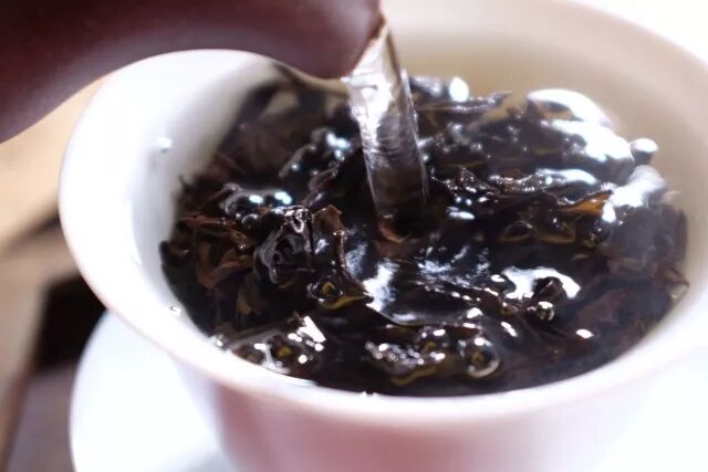 叶底软亮有弹性,蛤蟆背明显,因做青发酵熟透,加上微火慢炖吃火饱足之缘故,叶底转色均匀且棕褐油润,叶底香深沉且带有特殊的山场气息。