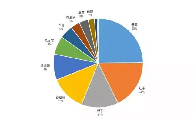 以总销售额占比排序:普洱茶25%,红茶18%,绿茶14%,花草茶13%,铁观音9%。