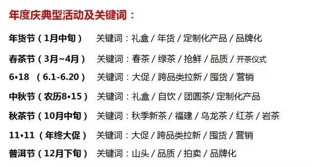 茶叶如何在电商平台冲出红海?京东数据给出了全年活动方案及相关关键词,在相应时间把握好产品推广方向,一定会让产品有不错的销量。