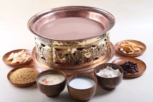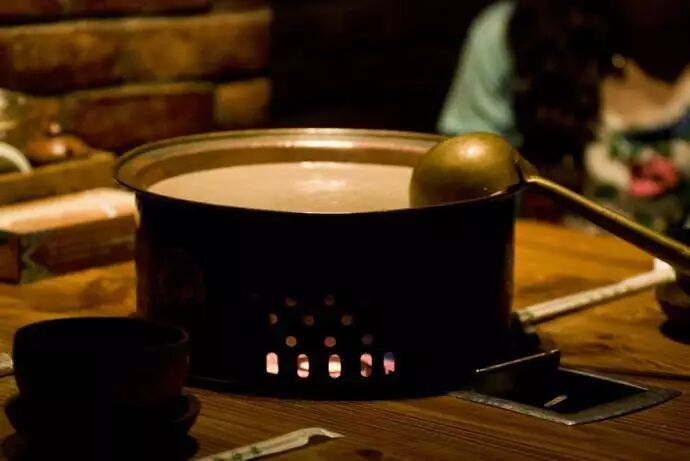 而在煮好奶茶底之后,侍应就会当着客人的面,把酥油、奶豆腐、奶酪、炒米、牛肉干等料一样样放进锅里,手拿大勺反复搅动,然后把旁边大肚子奶壶里煮好的奶茶倒进铜锅,待再次烧开后,就盛进客人面前的木碗中可以饮用了。