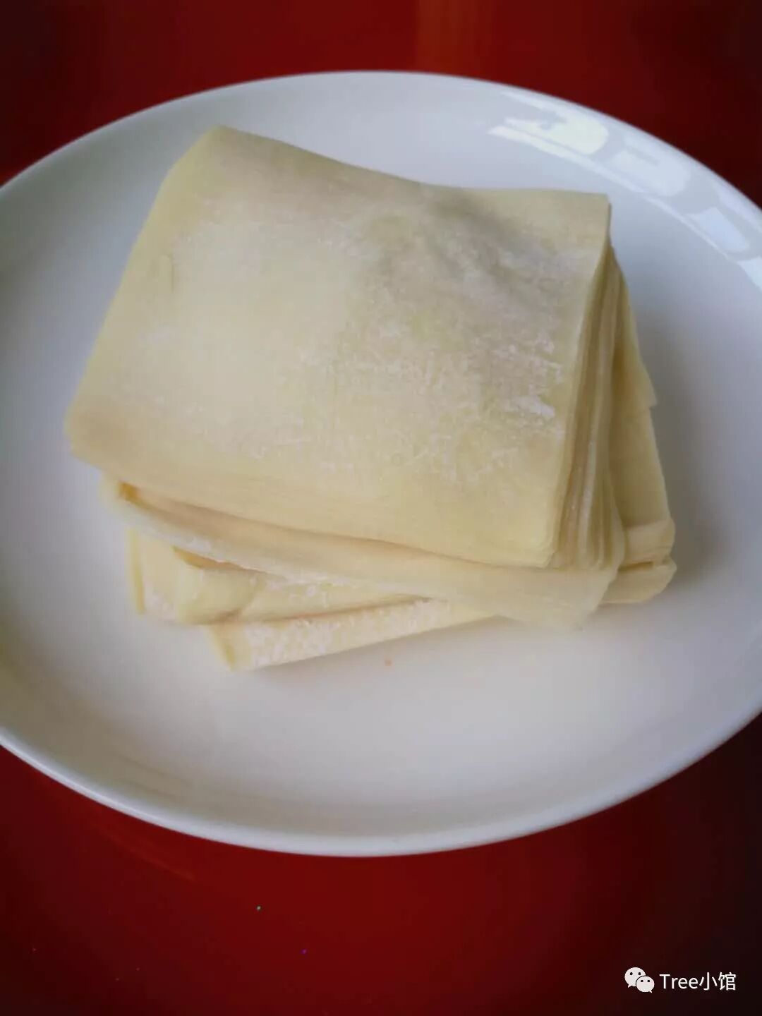 皮(正常版):开水烫面,稍硬些,擀成饺子皮,再将三四个饺子皮用淀粉做补面摞在一起,擀开即可,要边薄中间稍厚些。