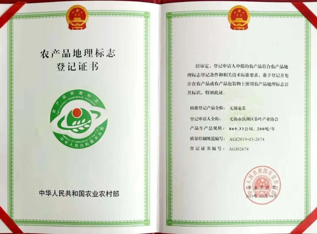 2019年,无锡毫茶一一获评国家农产品地理标志,这是无锡市继阳羡雪芽茶、阳山水蜜桃之外的又一个国家农产品地理标志。