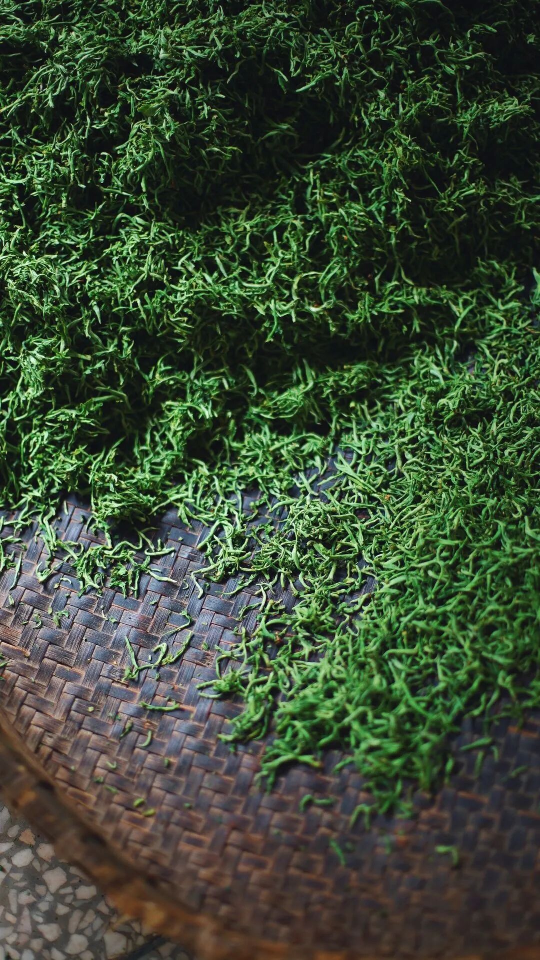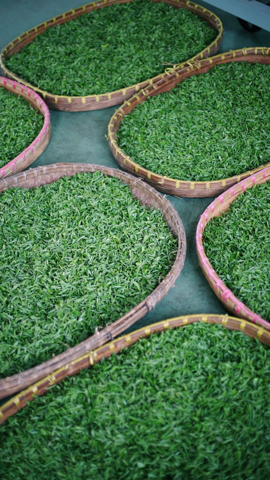 ▲采摘回的鲜叶要及时在室内阴凉处进行摊凉,摊叶厚度在3至5厘米之间,时长据气温而定,一般也要6小时左右。