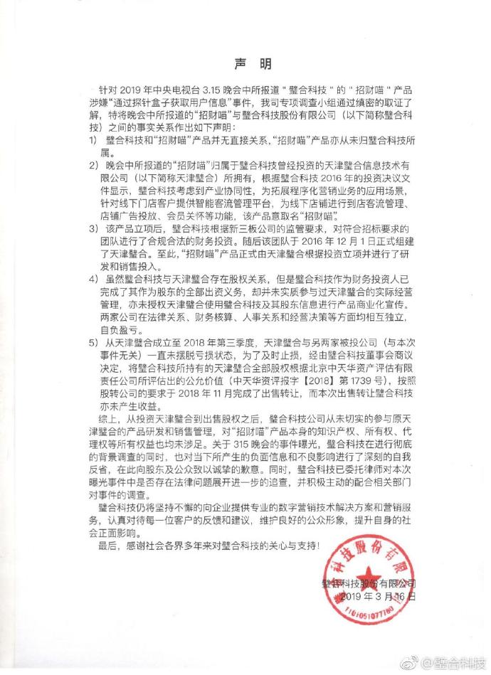 凤凰网财经讯 北京时间周六(3月16日)早间消息,针对央视3.15晚会中所报道"璧合科技"的"招财喵"产品涉嫌“通过探针盒子获取用户信息”事件,璧合科技发布声明称:璧合科技和“招财喵”产品并无直接关系,“招财喵”产品亦从未归璧合科技所属,公司系财务投资,“招财喵”归属于璧合科技曾经投资的天津璧合所拥有。虽然璧合科技与天津璧合存在股权关系,但是璧合科技作为财务投资人已完成了其作为股东的全部出资义务,却并未实质参与过天津璧合的实际经营管理。