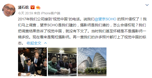 潘石屹在文中提到:“望京SOHO是我们建的,摄影师是我们请的,怎么会侵权呢?我们把调查结果告诉了视觉中国,就没有下文了。”
