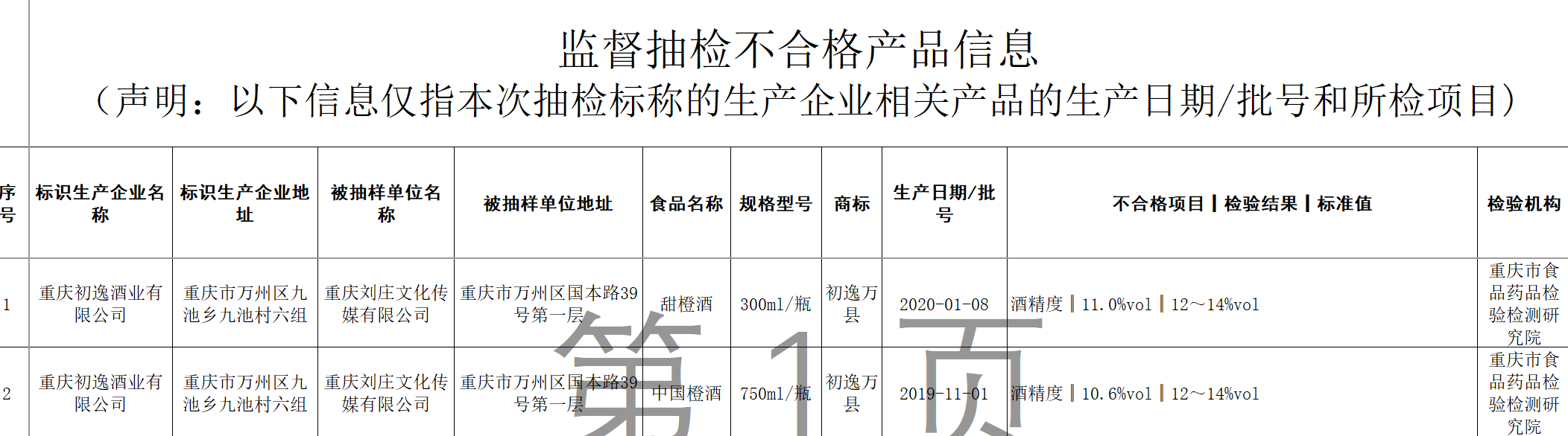 重庆刘庄文化传媒有限公司销售的重庆初逸酒业有限公司标称生产的甜橙酒和中国橙酒,酒精度不符合产品标签标示值。检验机构为重庆市食品药品检验检测研究院。