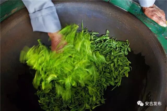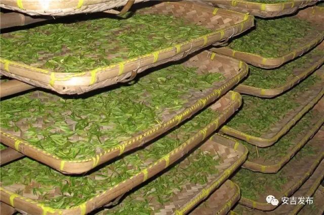 但是炼成安吉白茶却并不简单,需要经过采摘→摊放→杀青→理条→初烘→摊凉→复烘→保存等繁琐的工序。