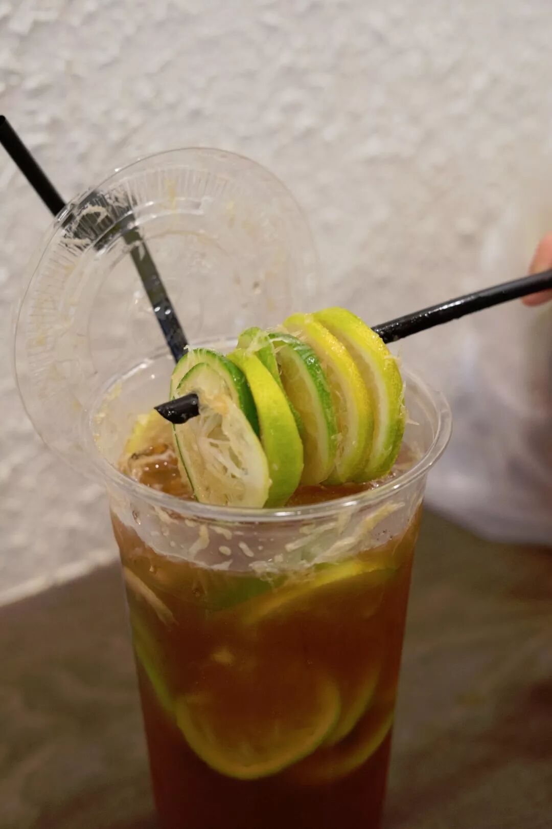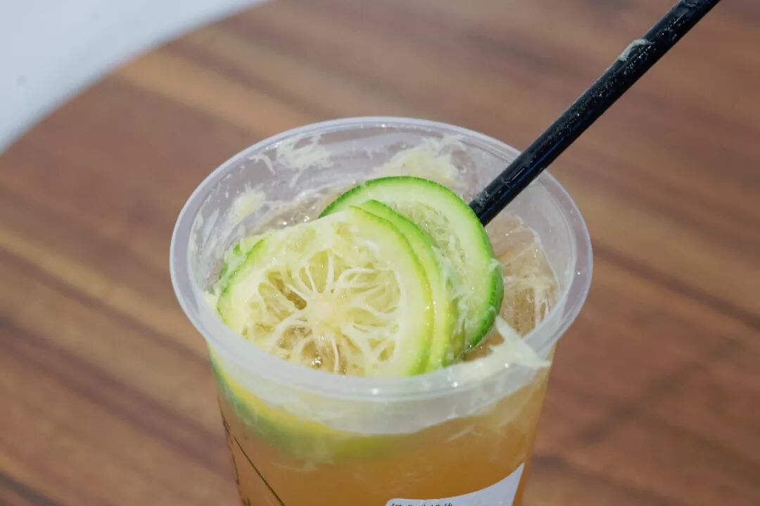 一杯里放了一片香水柠檬+青柠,刚入口柠檬味比较重,有一丢丢偏甜,喝下去很一秒解暑,缺点是放久了喝会变涩