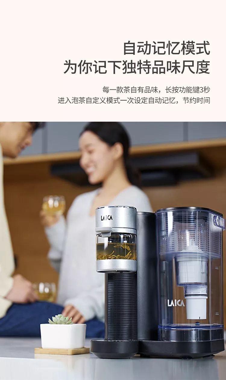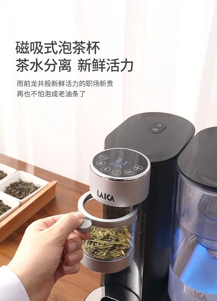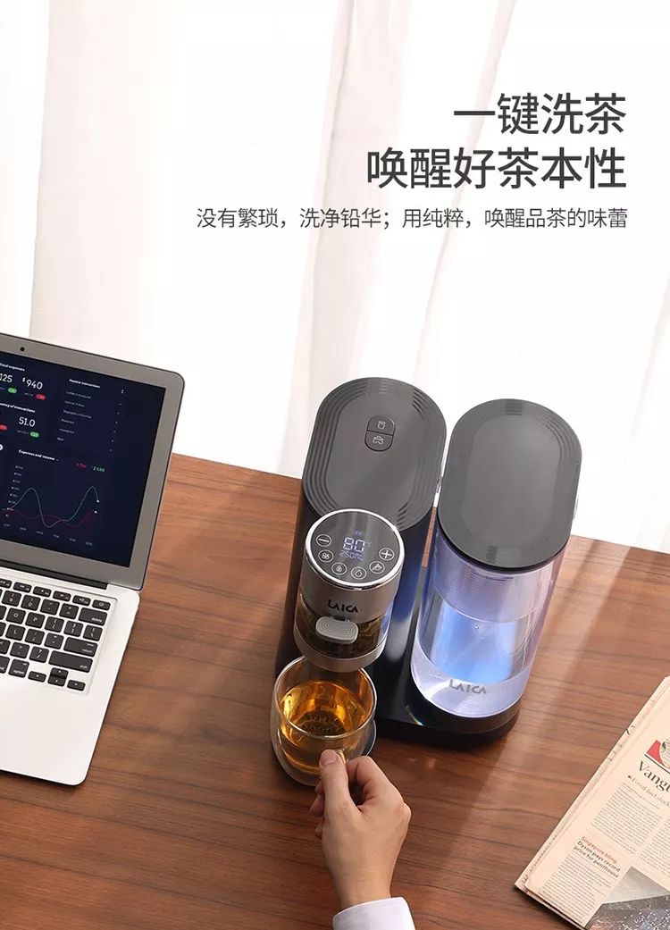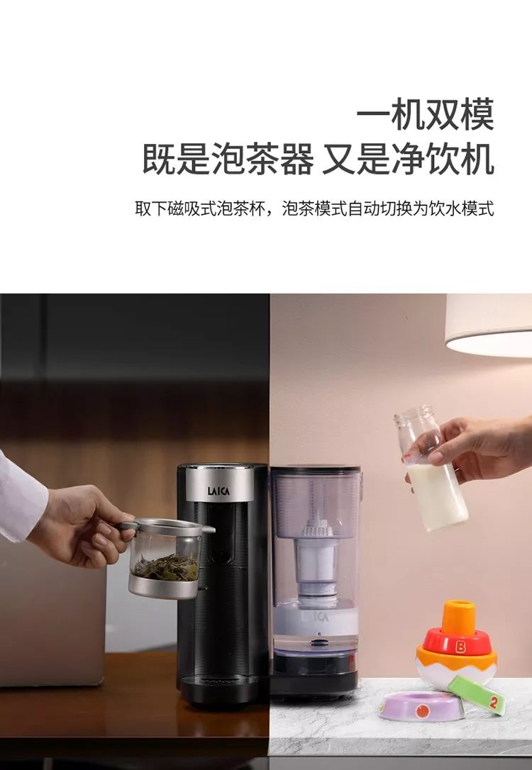 前阵子,我给大伙儿推荐过一款【莱卡LAICA净饮机】,它是可以放在台面儿上的小型“净饮机”,不用大动干戈的装净水系统,不用改管道,不会产生大量废水,也不会太占地儿。最重要的是,它的净水效果非常好,滤出的水可以达到国家直饮水标准。而且它还集净水and控温于一体,不仅能喝到安心水,还能喝到热乎水,特方便,基本能满足咱们日常喝水、沏奶、泡茶、冲咖啡,全家老小的用水需求~最近天儿特冷,咱们喝温水热茶的需求更大了,尤其我这个喜欢喝茶的人,一天不好好喝杯茶就难受,对于喝茶这事儿,还没法儿凑合,如果一杯茶只为解渴不为好喝,那还不如喝白开水是不是?要泡一杯好茶,不仅对茶叶有要求,对泡茶的水质,水温,泡茶的工序也有严格的要求,要是不熟悉泡茶的工序,水没用对,温度没掌握好,那泡出的茶不是发涩,不对味儿,就是茶香出不来。。。可就糟践咱的好茶叶了。但是我现在是真没时间,家里也没那个多余的空间供我摆一个大茶案,每天洗杯、洗茶、冲泡,经过好几道繁琐的工序,再花大量时间来泡一杯正宗地道的“功夫茶”喝。所以如果你和我一样,对喝茶比较讲究,又没什么时间,家里也没地儿放那套喝茶家伙什儿,那我把【LAICA莱卡净饮机】的升级版——【LAICA莱卡净水泡茶一体机】推荐给屏幕那头儿的你,相信我,你一定也会特别特别需要它~正好赶在年货节带回家,价格还特划算,等过年的时候就可以轻轻松松泡出“好茶”来招待亲朋啦~它除了多了一个“泡茶”模式外,其他功能都和【LAICA莱卡净饮机】基本一样,我把它的功能一样一样跟你细说说哈~泡茶功能