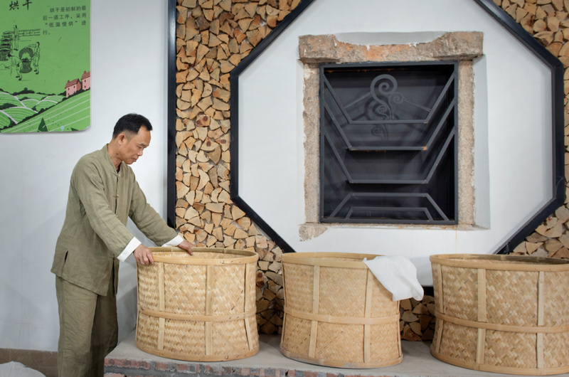 传统方法以白布包裹茶坯500~1000克,运用“揉、压、搓、抓、缩”手法,经三揉三焙交替进行,再用50~60℃的文火慢焙。